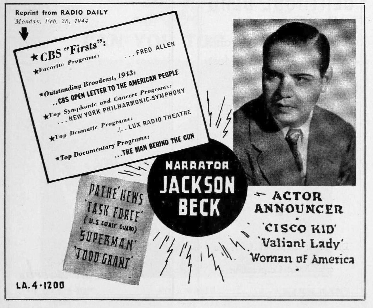 Beck was the son of silent film actor Max Beck, and began his radio career as far back as 1931, when he worked on the daytime drama Myrt and Marge. Jackson became one of the medium’s most reliable narrators, heard frequently on The March of Time and serving as the announcer on The Adventures of Babe Ruth. The actor never ventured far from his home base of NYC, and was part of the city’s extensive pool of first-rate radio performers, which allowed him to appear on such New York-based shows as The Brownstone Theatre, Bulldog Drummond, The Busy Mr. Bingle, Casey, Crime Photographer (as Inspector Logan), Cloak and Dagger, Creeps by Night, The FBI in Peace and War, Grand Central Station, Hercule Poirot, Inner Sanctum, Joe and Ethel Turp, The Joe DiMaggio Show, Life Can Be Beautiful, The Man Behind the Gun (replacing Everett Sloane as the show’s narrator), Matinee Theater, The Mysterious Traveler, Valiant Lady, Words at War, Woman of America, X-Minus One and You are There. Even as the curtain was about to close on radio in the 1960s, Beck could be heard on some of the medium’s last remaining programs like Have Gun – Will Travel, Suspense and Yours Truly, Johnny Dollar…and participated enthusiastically in the radio revivals of the 1960s/1970s with appearances on Theater Five and The CBS Radio Mystery Theater.