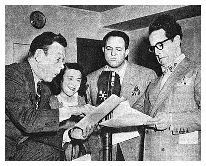 alanreed12Minerva Pious actually had a bit more acting experience than just the opera item on her resume. Before she settled on radio as her career, she had performed various character bits in New York stage productions and, while abroad, she dabbled in German and French dramatics in Salzburg. Still, her mastery of dialects was what kept her working on Fred’s weekly comedy broadcasts; whether it was The Salad Bowl Revue, The Sal Hepatica Revue, The Hour of Smiles, Town Hall Tonight, or The Texaco Star Theatre. It was on this last show that Allen would introduce the feature for which most old-time radio fans remember him best: “Allen’s Alley.” On December 6, 1942, the first four denizens to be interviewed were Senator Bloat (played by J. Scott Smart), John Doe (John Brown), Socrates Mulligan (Charlie Cantor) and Mrs. Nussbaum (Minerva). Mrs. N was the only original member of the group to remain through the various incarnations (which later saw the addition of Senator Claghorn, Titus Moody, Falstaff Openshaw, and Ajax Cassidy).