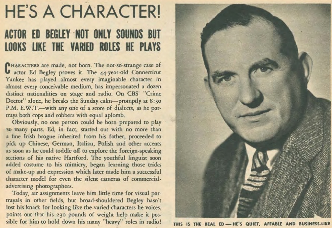 Ed Begley’s most unusual radio role would undoubtedly be that of the inscrutable sleuth who’d already gained popularity in motion pictures: Charlie Chan. Yes, just as Charlie was played onscreen by such non-Asian actors as Warner Oland and Sidney Toler, Ed gave voice to the Asian detective on a series of broadcasts over various networks (NBC, ABC, Mutual) and in various formats from 1944 to 1948. Begley later portrayed Sergeant O’Hara on The Fat Man, and for many was the definitive Lt. Walt Levinson on Dick Powell’s Richard Diamond, Private Detective. Crime dramas and mystery programs provided much work for the actor; Ed was heard on the likes of The Adventures of Philip Marlowe, The Adventures of the Saint, Box 13, Broadway’s My Beat, Casey, Crime Photographer, Crime and Peter Chambers, Crime Doctor, Crime Does Not Pay, The FBI in Peace and War, Jeff Regan, Investigator, Let George Do It, The Line Up, Night Beat, Rocky Fortune, Tales of the Texas Rangers, This is Your FBI, and Yours Truly, Johnny Dollar. Rounding out Begley’s radio resume were guest roles on such popular shows as Creeps by Night, Escape, The Man Called X, The Marriage, The Molle Mystery Theatre, The Story of Dr. Kildare, Stroke of Fate, Suspense, The Whistler, and Words at War.