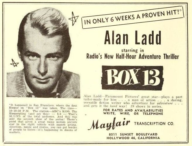 Alan Ladd’s most famous radio contribution came in the form of an adventure series entitled Box 13, a syndicated program from Mayfair Productions. (“Mayfair” had been the name of a chain of restaurants the actor invested in with his old friend Bernie Joslin.) Box 13 featured “Laddie” as Dan Holiday, a retired-newspaper-reporter-turned-mystery-novelist who got inspiration for his books with the insertion of a simple ad in his local paper: “Adventure wanted. Will go anywhere, do anything. Box 13.” Although the series was produced for syndication, the series aired on both the West and East Coast Mutual networks. The strides made in transcribing shows for later broadcast meant that Alan did not need to not be tied down to a weekly series. Thus he was able to star in such films as Saigon (1948; his final teaming with Veronica Lake), Whispering Smith (1948), The Great Gatsby (1949), and Chicago Deadline (1949).