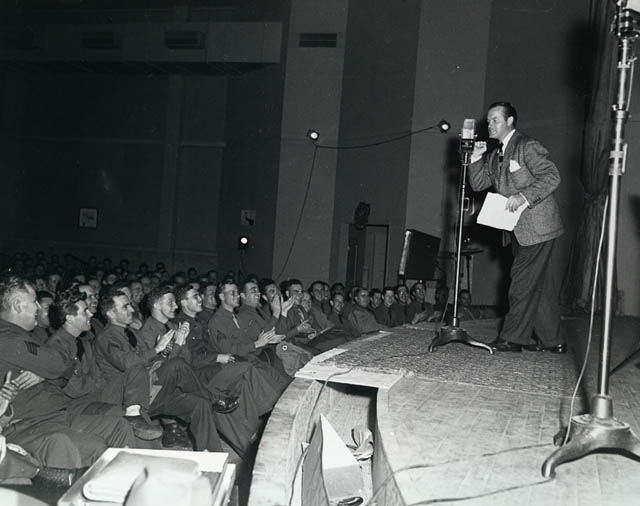 “During America’s involvement in World War II,” wrote Arthur Frank Wertheim in Radio Comedy, “the radio comedians helped boost national morale. The jokers had kept listeners laughing during the Great Depression; now the war against Japan and Germany was another critical time.” The primary “jokers” keeping spirits up on the homefront were undoubtedly Jim and Marian Jordan—a.k.a. Fibber McGee & Molly. The Office of War Information, created to coordinate existing government information services and to promote wartime propaganda both at home and abroad, no doubt marveled at how skillfully Fibber scribe Don Quinn subtly weaved pro-war messages into the show’s scripts (though after the way Quinn managed to integrate the Johnson’s Wax commercials into the program, it shouldn’t have been too surprising). While Fib & Molly (and many other sitcom stars) took up the fight at home, it was Bob Hope who stormed the beaches overseas by broadcasting his popular program to the troops. Technically, Hope started before the U.S. entered the war (in March of 1941)—but once he set the precedent, fellow mirthmakers like Jack Benny, Edgar Bergen, and Burns & Allen soon followed suit.
